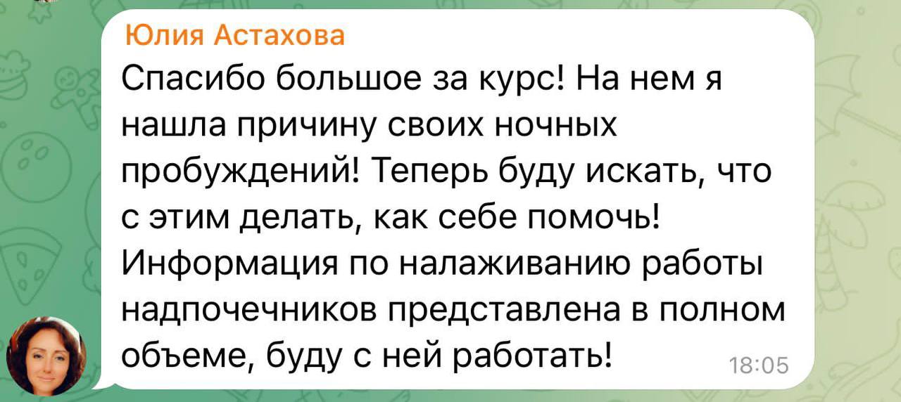 Спасибо большое за курс! На нем я нашла причину своих ночных пробуждений! Теперь буду искать, что с этим делать, как себе помочь! Информация по налаживанию работы надпочечников представлена в полном объеме, буду с ней работать!